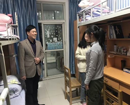 根据校党委关于副处级以上领导干部联系班级制度“六个一”工程的统一部署,结合商学院领导干部联系班级制度实施方案的统一要求,2018年11月15日17时,基建处处长曹和平老师、发展规划处处长刘岩老师以及商学院全体领导干部走进商学院学生寝室,了解学生的思想动态,在服务引导中加强思想教育,把解决思想问题与解决实际困难结合起来,助力学生成长成才。